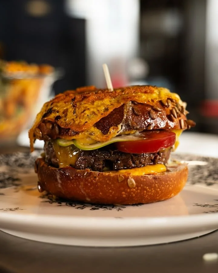 Salade, Tomates, Pickles, Oignons Rouges, Échalotes Confites, Steak Haché Maison, Tomme, Cheddar Et Taleggio.